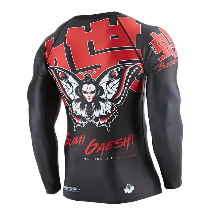 Black long sleeve rash guard, with a Japanese inspired butterfly print and bold Kanji.