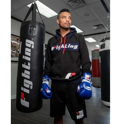 Stay warm and be ready in the Fighting Hooded Sweatshirt. Perfect for warming up in the gym or wearing around town, you’ll be fight ready anytime. With the convenient front pocket, you can keep your hands warm and your valuables close at all times!