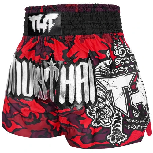 Inspired by Military camouflage, the use of camouflage by an armed force is to protect themselves from enemies. The primary function of camouflage is to deceive the human eye. Some of the earliest usage of camouflage patterns on military uniforms was commonly seen during World War II. The red-printed camouflage is no ordinary. Red brings excitement and passion to the fighter. The shorts are made with outstanding hand-made quality and sublimation printing technology. Features a hand-stitched embroidered “Muay Thai” PU.
